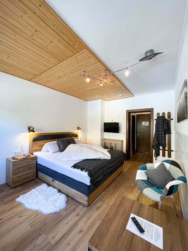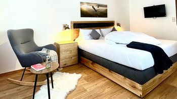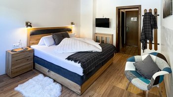 Jedes Zimmer ist ein Urlaubszuhause in dem man sich vom ersten Moment an wohl und geborgen fühlt. Natürliche Materialien mit viel Holz, einladende Polstermöbel und ein Balkon, von dem aus Sie das beeindruckende Bergpanorama genießen können, garantieren pure Erholung.